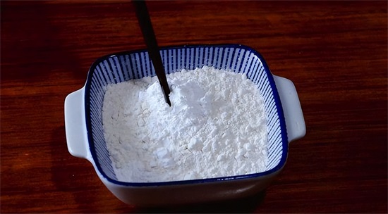 4、准备一个大碗,装入适量的淀粉加入一点盐,用水调成浓稠的浆糊;
