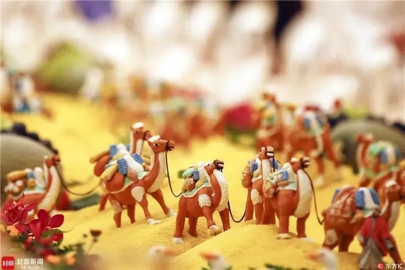 从左到右的餐桌设计体现了我国各种历史文化建筑的造型,以及丝绸之路和一带一路的标志和设计元素。绿色草地形象表示各国合作发展是基于健康保护地球环境的理念,而长桌从东到西的方向则象征着中国古代丝绸之路从东方到西方的经商合作之路。