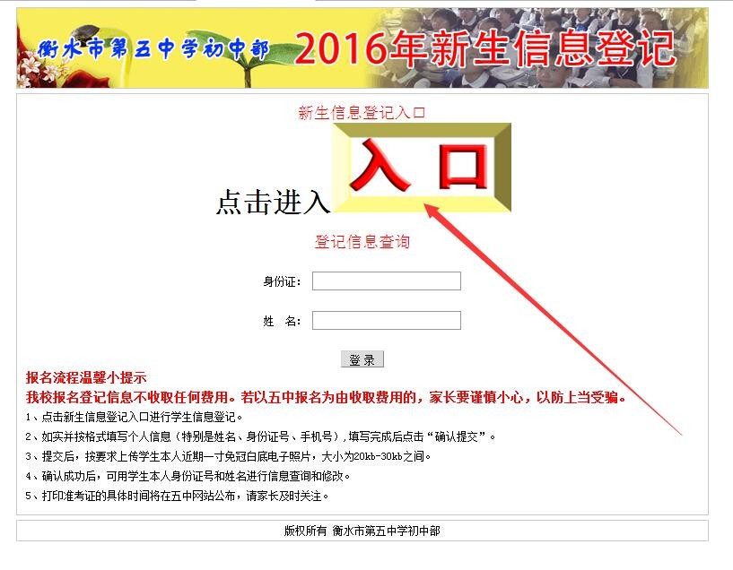 3、弹出2016年新生信息登记窗口,点击入口进入
