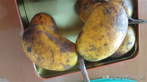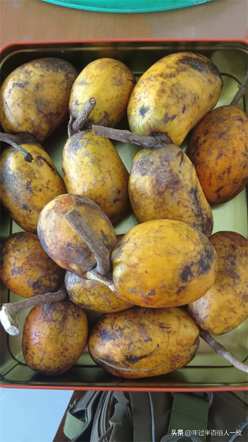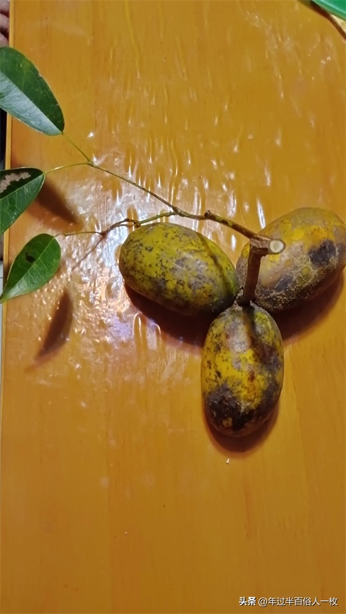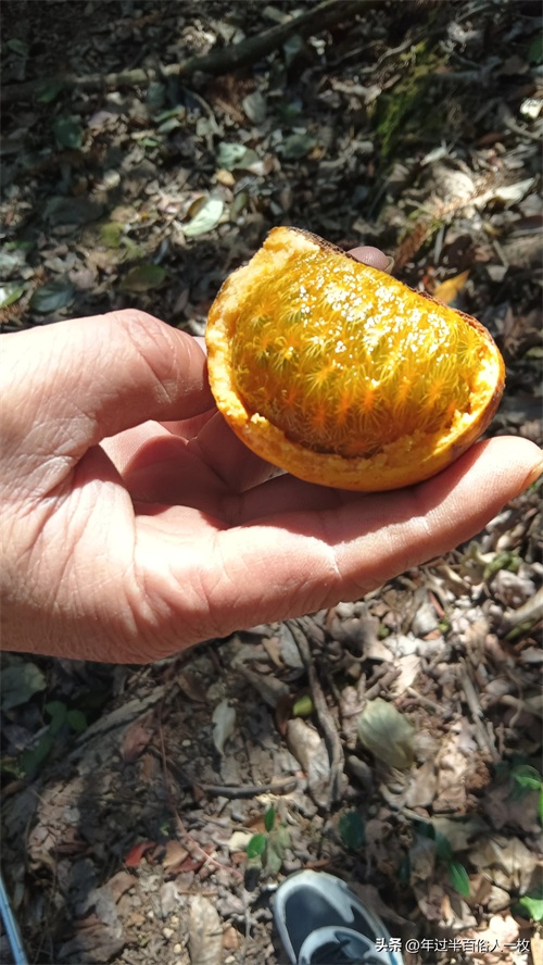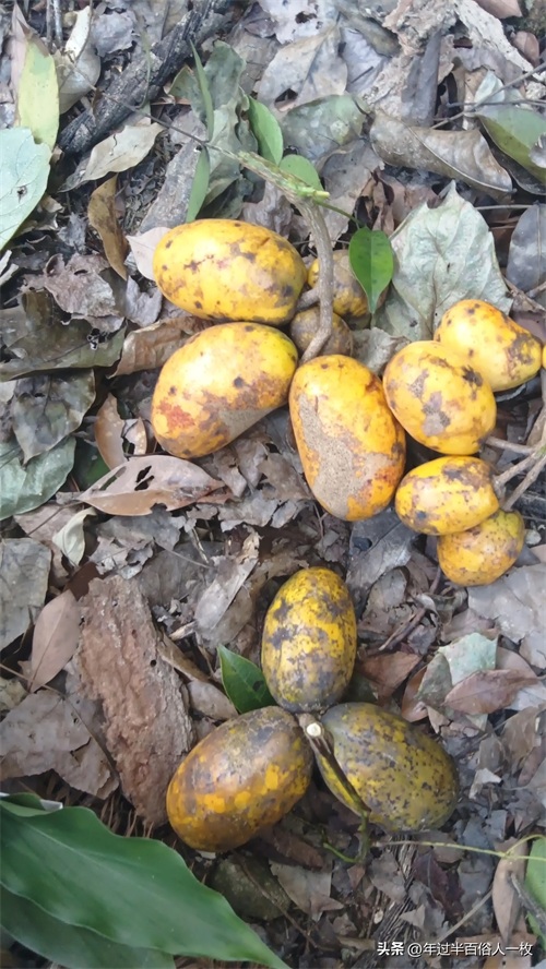 你看金黄色的果肉多么的诱人。此果子有的结一个,也有对生二个一起,也有三个一起及四五个串在一起,爬到树上,用树枝勾住蔓藤,拉下采摘,带回家中,让老母亲品尝。