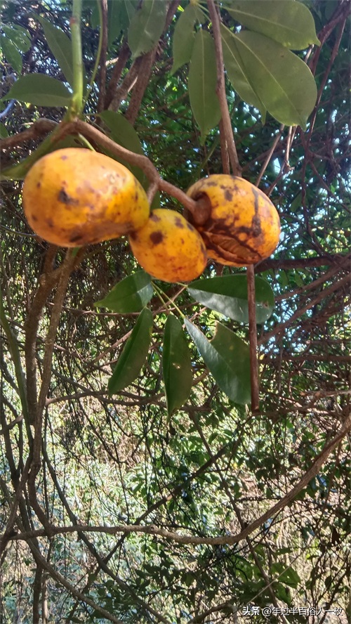 此果子的根茎粗壮,一般会顺着旁边的大树往上长,一直长到树梢上面,周边的几棵高大的树上全是这一颗根筋蔓延上去的。成熟的季节,树稍上面遍布了金黄色的果实,采摘十分困难。熟透的会自然开口,常常是鸟类的美食。