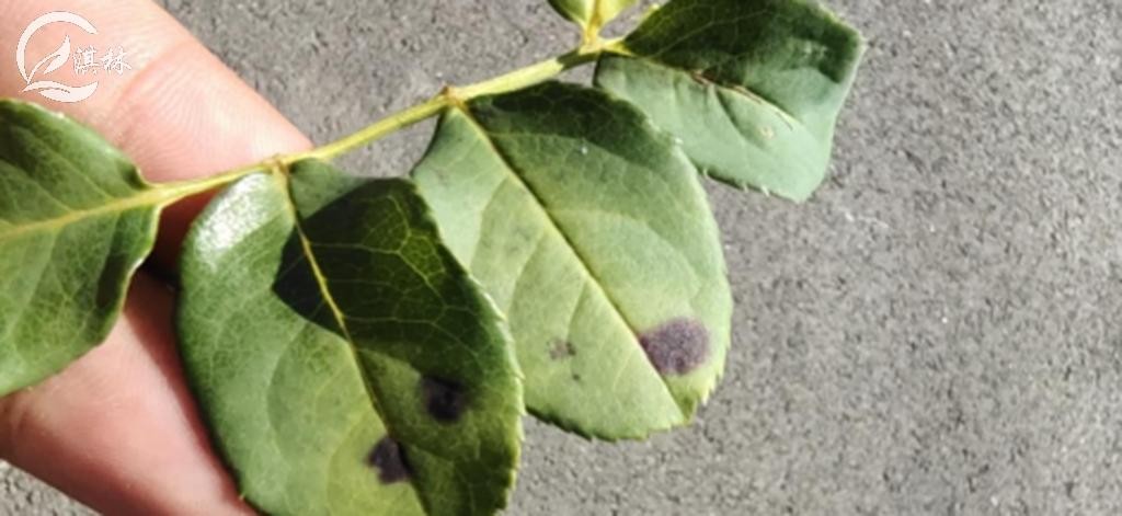 黑斑病的症状与褐斑病大致相似,为害部分相同,两者可同时混合发生,7-9月为发病盛期。发病初期叶表面出现红褐色至紫褐色小点,逐渐扩大成圆形或不定形的暗黑色病斑,后期病斑上散生黑色小粒点,即病菌的分生泡子盘。严重时植株下部叶片枯黄,早期落叶,致个别枝条枯死,如月季黑斑病。