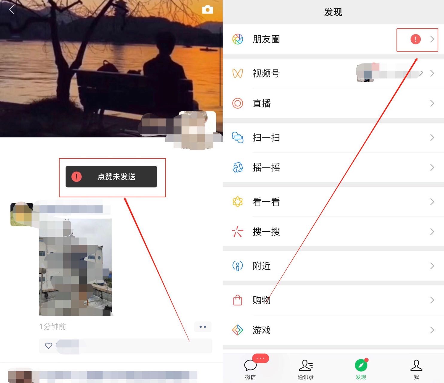 当出现点赞未发送的情况之后,“点赞未发送”的字样会一直出现在朋友圈的顶部。并且在微信的“发现”页面,“朋友圈”一栏中会有一个红色的感叹号。