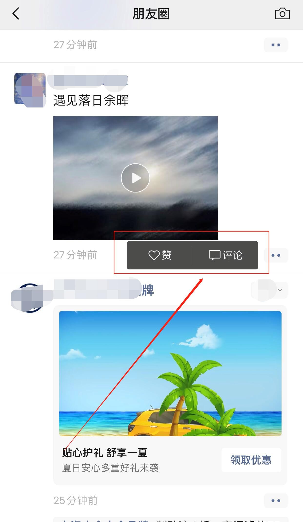1、朋友圈界面,每条朋友圈右下角都有一个消息图标,点击图标即可进行点赞或评论。