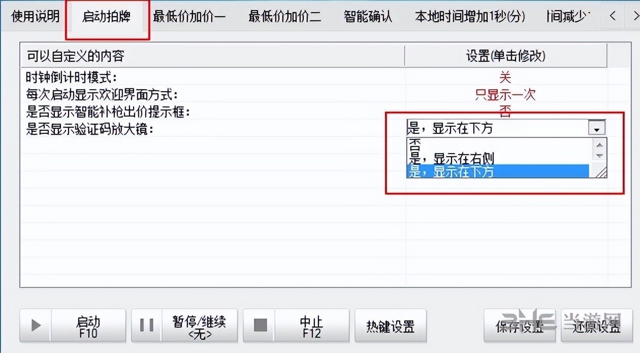 是否弹出验证码,以及默认弹出的位置都可以在“启动拍牌”页中进行设置: