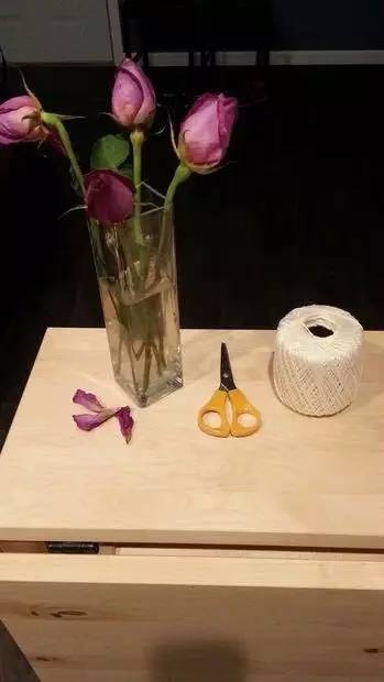 材料:你需要绳子,剪刀和你的花(可以是玫瑰或者其他花材,这里以玫瑰为例) 你也需要一个地方把它们挂起来