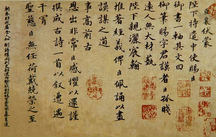 而蔡襄的书法"蔡体"则以正楷见长,亦擅行书、草书,风格"深厚端庄、淳淡婉美"。传之于世有名的代表作品有《自书诗帖》、《谢赐御书帖》、《蒙惠帖》、《陶生帖》、《郊燔帖》以及《万安桥记》、《昼锦堂记》等珍品碑刻。