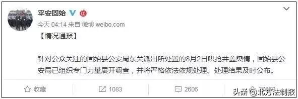 固始县公安局官方微博@平安固始 就此事发布通报:针对公众关注的固始县公安局东关派出所处置的8月2日哄抢井盖舆情,固始县公安局已组织专门力量展开调查,并将严格依法依规处理。处理结果及时公布。