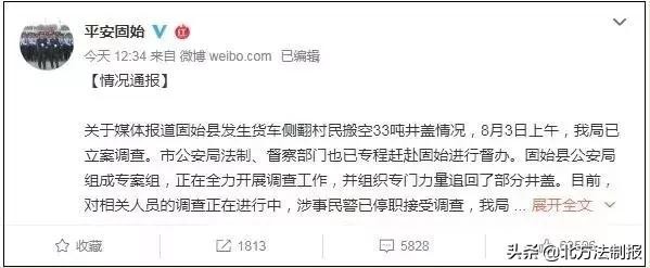 @平安固始 再度发布通报,已成立专案组全力开展调查工作,并组织专门力量追回了部分井盖,涉事民警已停职接受调查。