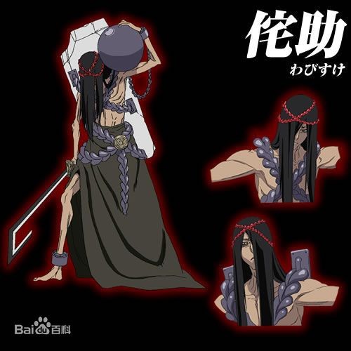 侘助实体化后的外貌是扛着大铁球,背着一个石板,有锁链捆绑着身体的长发青年男子,性格阴沉,言语极少。