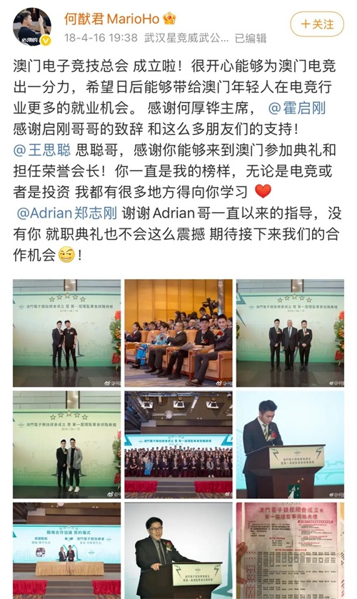 澳门电子竞技总会成立时,何猷君特意在微博上感谢了王思聪