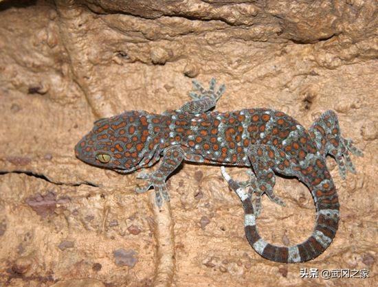 大壁虎(学名:Gekko gecko):俗称蛤蚧、又称仙蟾,台湾称为大守宫。体型较大,体长可达30厘米以上,头长大于尾长。背腹面略扁,头呈扁平三角形;皮肤粗糙,全身密生粒状细鳞;体色有深灰色、灰蓝色、青黑色等,头、背部有深灰、蓝褐等颜色横条纹,全身散布灰白色、砖红色、紫灰色、橘黄色斑点,尾有白色环纹。吻鳞不接鼻孔。背部粒鳞间散布的疣鳞约12-14纵列。指、趾间微蹼。尾基每侧肛疣1个或2-3个,雄性肛前孔和股孔16-26个。