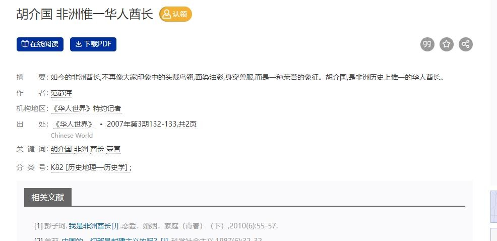 参考资料:[1]范彦萍.胡介国 非洲惟一华人酋长[J].华人世界,2007(3):132-133