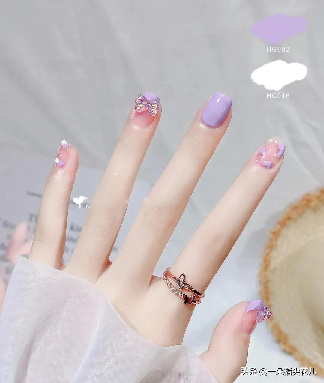 第七款:藕荷紫色花爱心彩绘,法式半甲,云朵色块。搭配树脂激光蝴蝶结。
