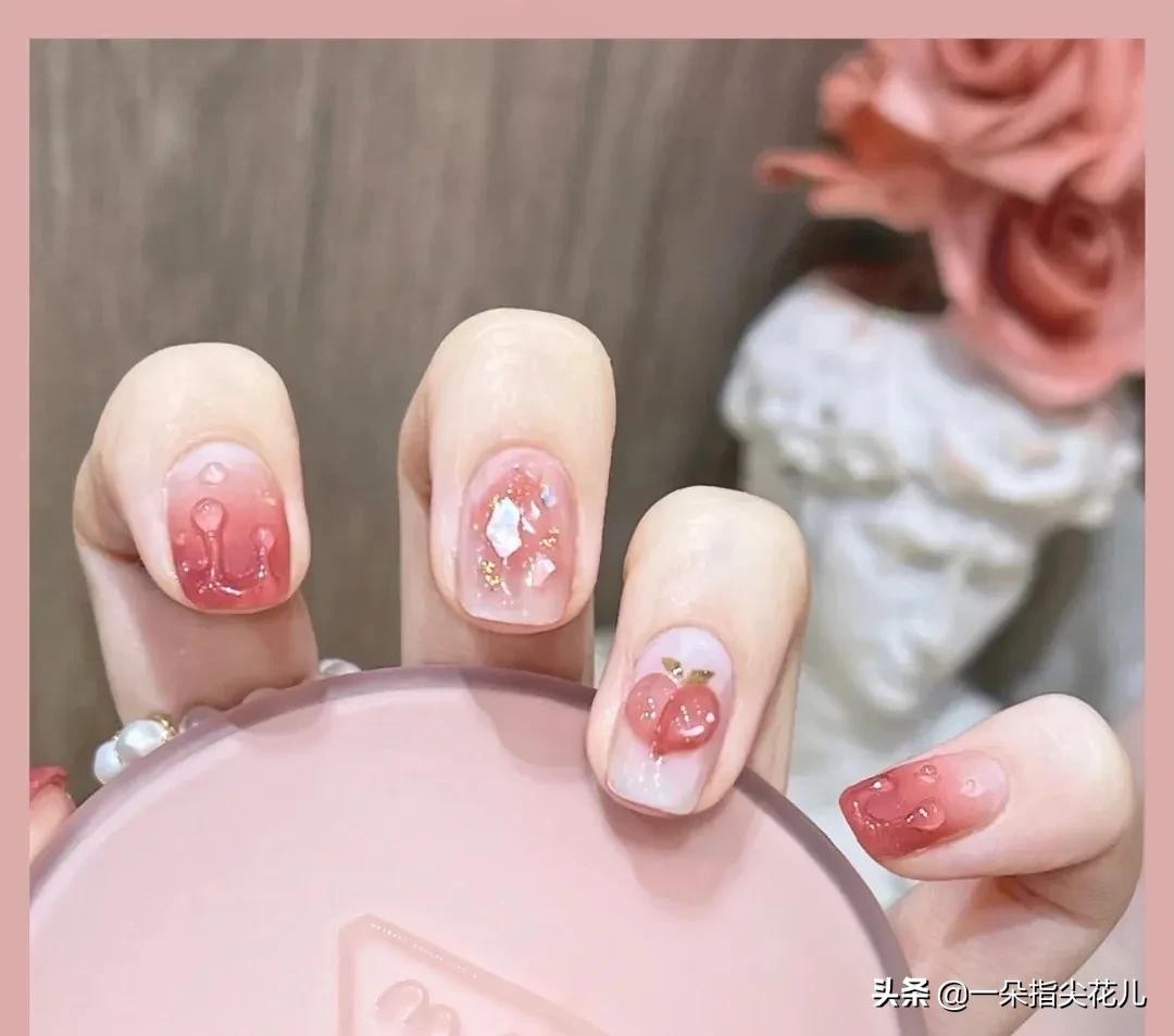 第五款:桃红色渐变,做磨砂底色,搭配立体水滴效果。无名指果冻白打底,彩绘桃子,做立体效果(推荐大力胶操作,简单易上手。)