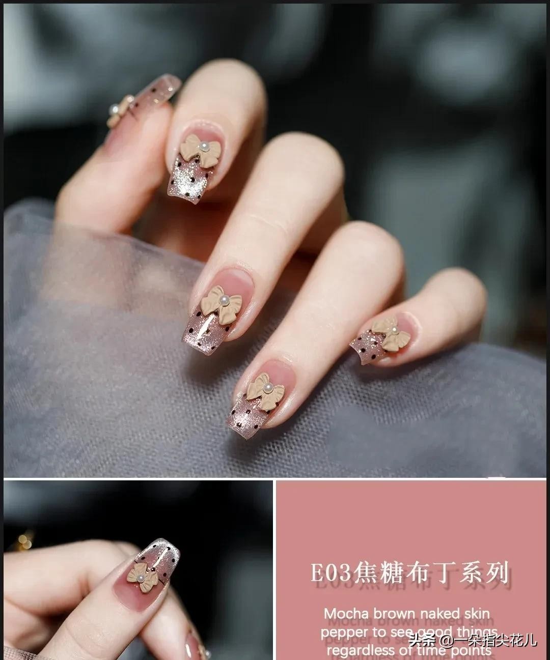 第二款:果冻肉粉色打底,指尖晶石猫眼。点黑色波点。搭配迷你咖色蝴蝶结。
