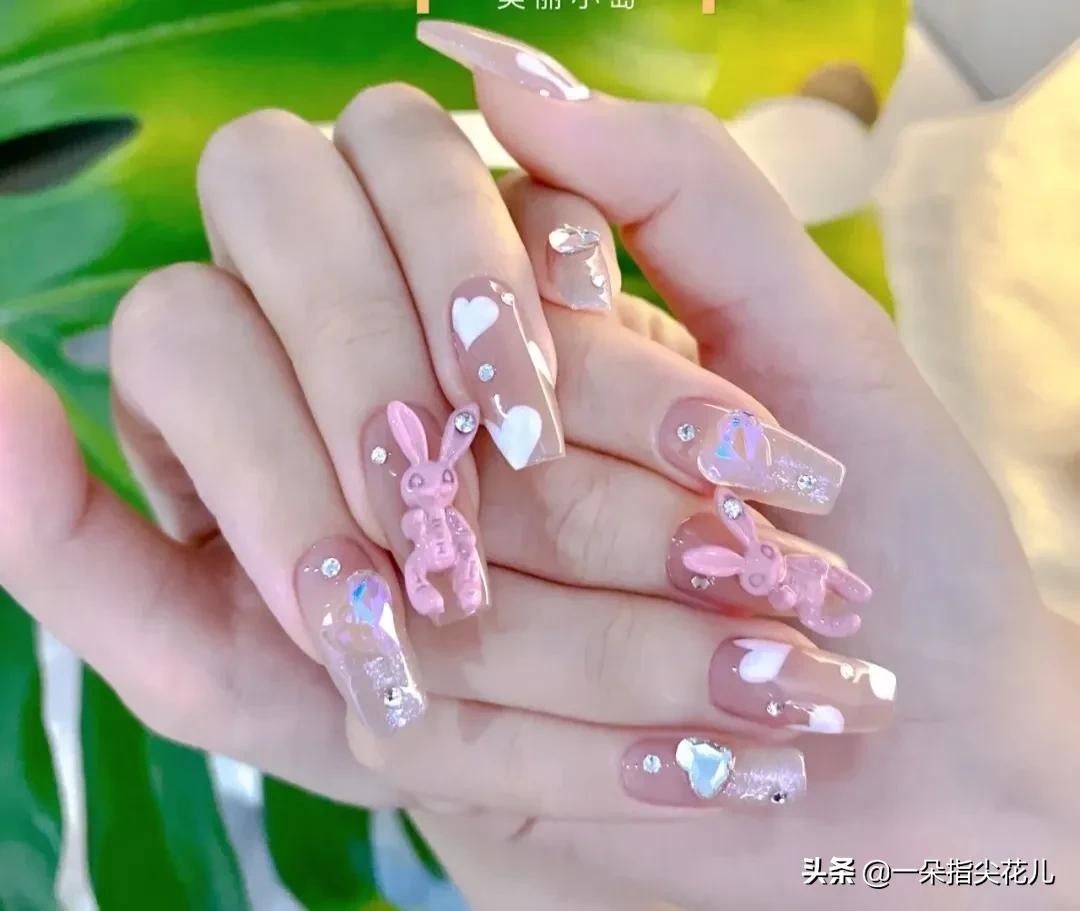 第一款:彩绘爱心,搭配可爱兔子和蝴蝶结饰品。(兔子彩绘斑点,用雕花胶做出兔尾巴和耳朵)