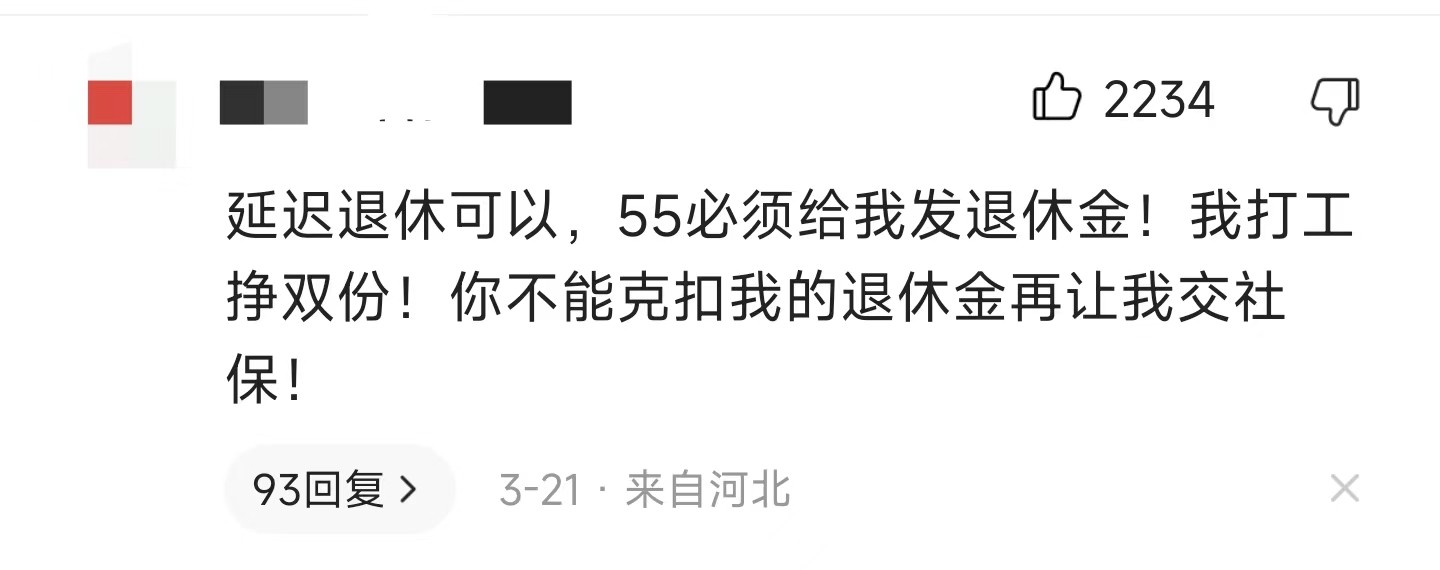有的网友说,“延迟退休可以,但不能又克扣我的退休金又让我交社保啊”。还有的网友说,“我当然不愿意延迟退休了,相信大部分工薪阶层都不愿意,灵活就业就更不愿意了,他们几乎是食不果腹拿一半的钱交社保,还要让我们怎样?”