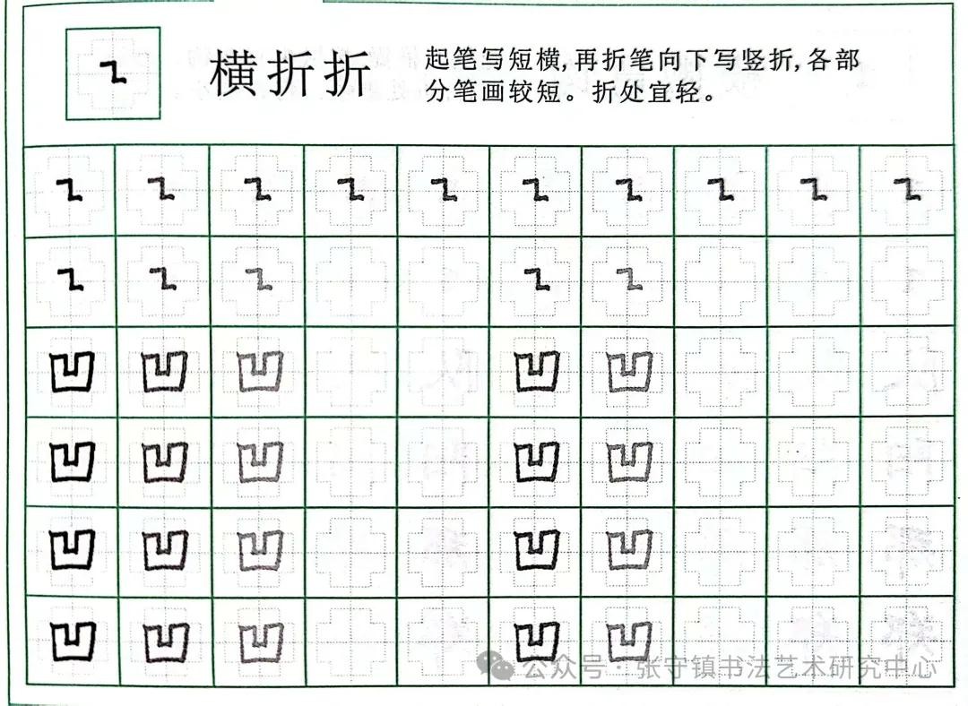 横折折:起笔写短横,再折笔向下写竖折,各部分笔画较短。折处宜轻。