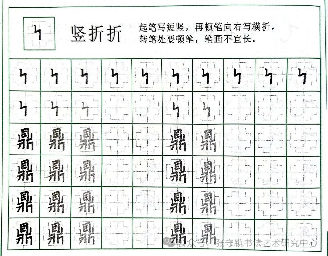 这四个笔画在很多的字中都有应用,比如:鼎、专、与、凹等字。接下来,就来讲解一下竖折折、竖折撇、竖折折钩、横折折的书写要点。