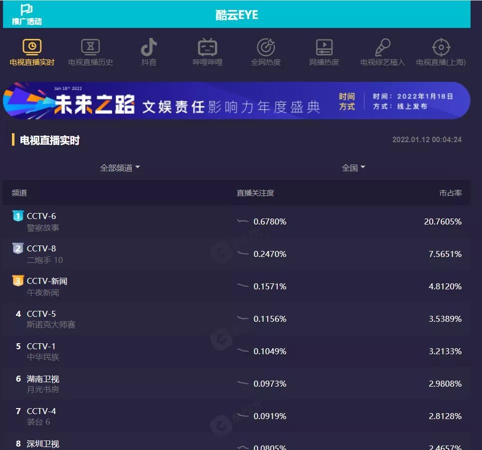 酷云EYE:通过微信小程序“酷云EYE”或者官方网站(直接百度搜索酷云eye即可)查询,数据相对详尽,值得注意的是这套系统里的节目时长包括后续广告。另外,受限于节目单不能及时调节等因素,查看前一天的节目收视至少到十一点之后再看比较靠谱