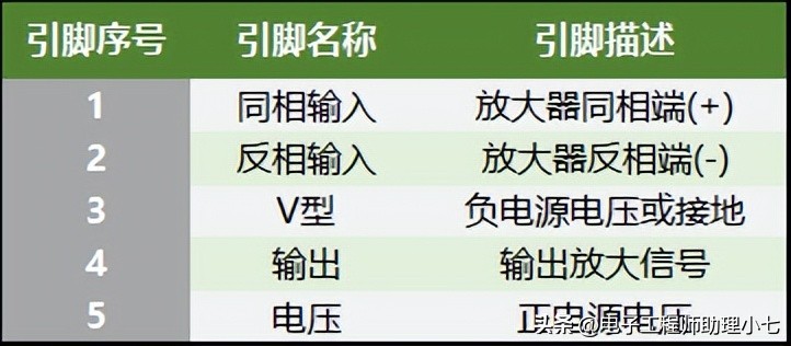 引脚1/同相输入:放大器的同相端(+)。引脚2/反相输入:放大器的反相端(-)。引脚3/V 型:接地引脚或负电源电压。引脚4/输出引脚:输出放大的信号。引脚5/Vss:正电源电压引脚。