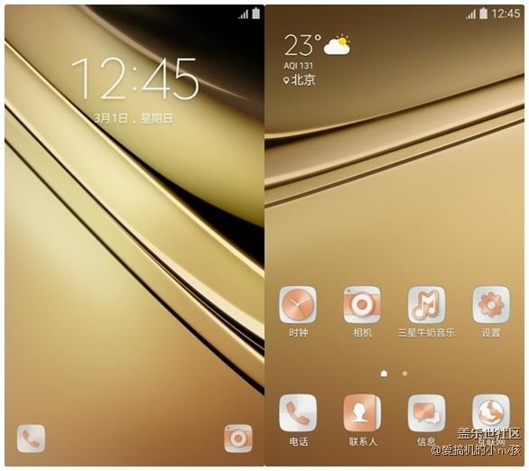 首先在UI界面上,这次的界面设计更加清新简约了。而且三星的Galaxy C系列根据不同的机身颜色定制了专有风格的UI,比如枫叶金就内置了一套名为Gold Platinum的主题,看起来和谐统一而且个性十足。