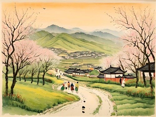 牧童遥指杏花村:远处的牧童指向远方的杏花村,那里有酒家。