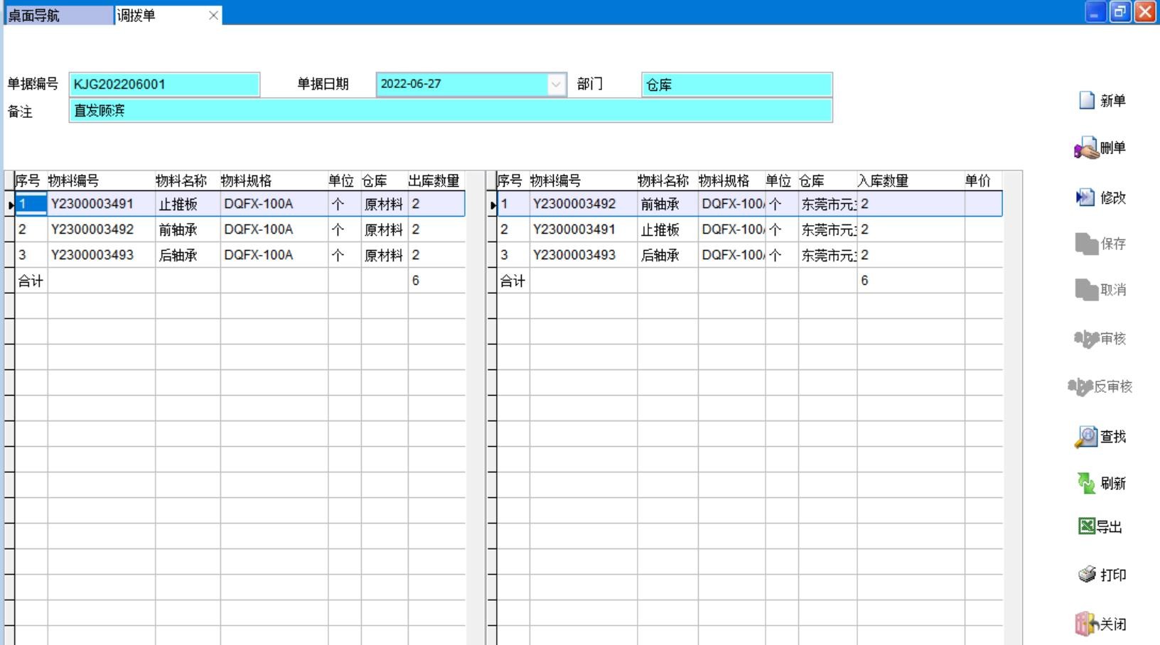 调拨单是仓库的常用单据,是将物料从A仓调拨到B仓,通常调拨过程中数量不变、金额不变。