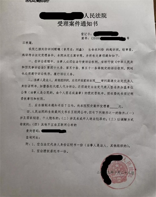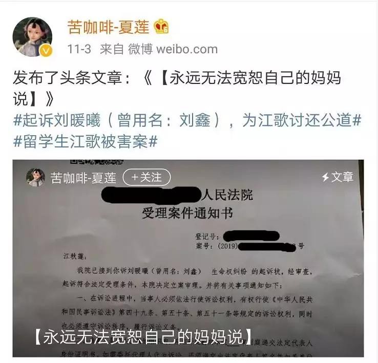 打开江歌母亲@苦咖啡-夏莲 的微博,置顶的一篇是2019年11月3日发布的法院受理案件通知书,11月3日,也是江歌三年前出事的日子。通知书上显示,江歌的母亲以生命权纠纷起诉刘暖曦(曾用名:刘鑫)的案件在2019年10月28日立案成功。