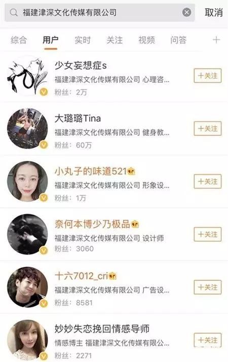 @冷眼萌叔 的微博认证为“福建津深文化传媒有限公司”,通在企业查询网站,记者查询到了这家注册地址位于福建福州的文化传媒公司。公司在网站上提供的信息很少,主要成员只有两位,大部分信息数据都为0,记者拨打了注册留下的电话,提示对方已关机。随后,记者在微博搜索这家公司,意外发现,有十几个微博的id认证为该公司的董事、设计师、健身教练、心理咨询师等等,粉丝数量都不少。