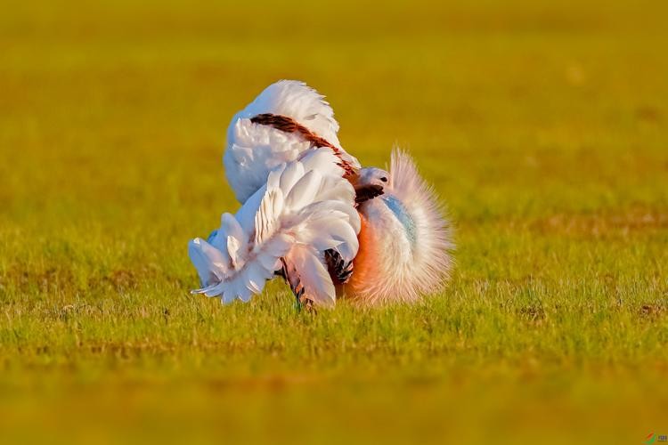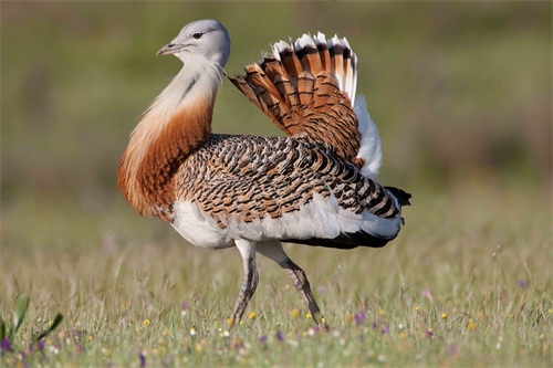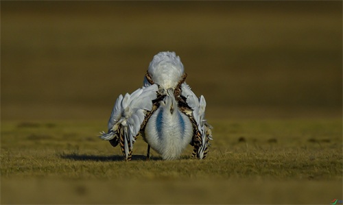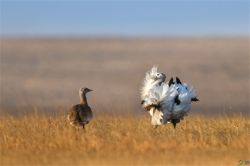 此外,它的求偶方式跟孔雀开屏也有异曲同工之妙。在每年的3、4月,雄性大鸨们为了获得异性的青睐,就会纷纷聚集在草原上“斗舞”。