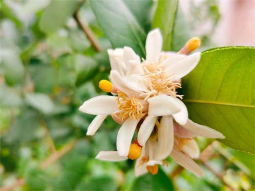 柚子和桔子、柠檬一样,是芸香科、柑橘属植物。花蕾淡紫红色,花白色,花瓣长度2厘米左右,瓣片倾斜伸展或向背面卷曲。洁白的花瓣与鲜黄的花粉交相辉映,清秀迷人。