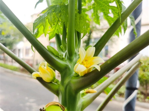 木瓜学名番木瓜,是番木瓜科、番木瓜属常绿软木质小乔木。木瓜花的奇特之处在于花分雌、雄、两性三种,咱们普通人不容易区分开。木瓜花乳白色或淡黄色,共5个瓣片,生于叶腋处,给人的感觉像是摆上去的腊质假花。