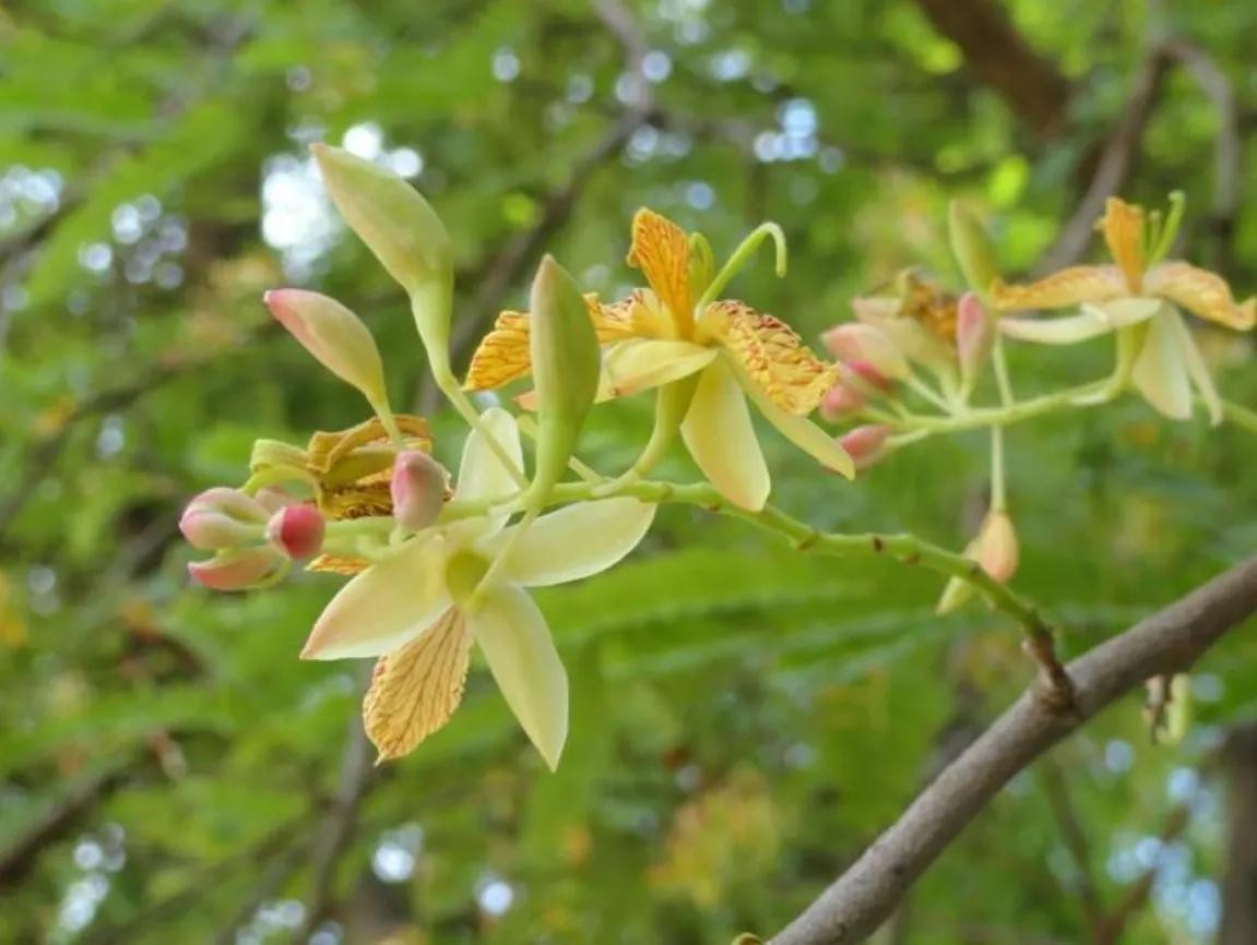 酸角是豆科、酸豆属热带亚热带植物。酸角含苞未放阶段,红红的花蕾像琴叶珊瑚;花开后婀娜多姿,飘飘欲仙,仿如石斛兰,又似鸢尾。是果树花中少见的特别漂亮的花。