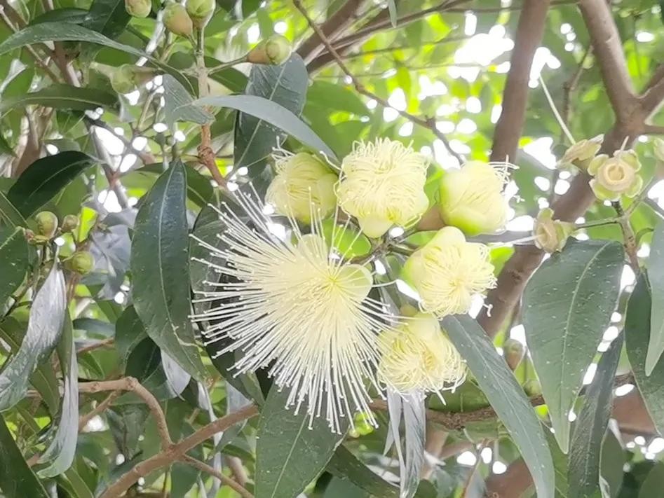 水蒲桃是桃金娘科、水蒲桃属热带果树。一年四季几乎都有花朵开放。水蒲桃的花朵与莲雾的花朵就像双胞胎,只是颜色上略有差别。水蒲桃的花瓣呈绿白色,明显长于花瓣的花丝为乳白色。