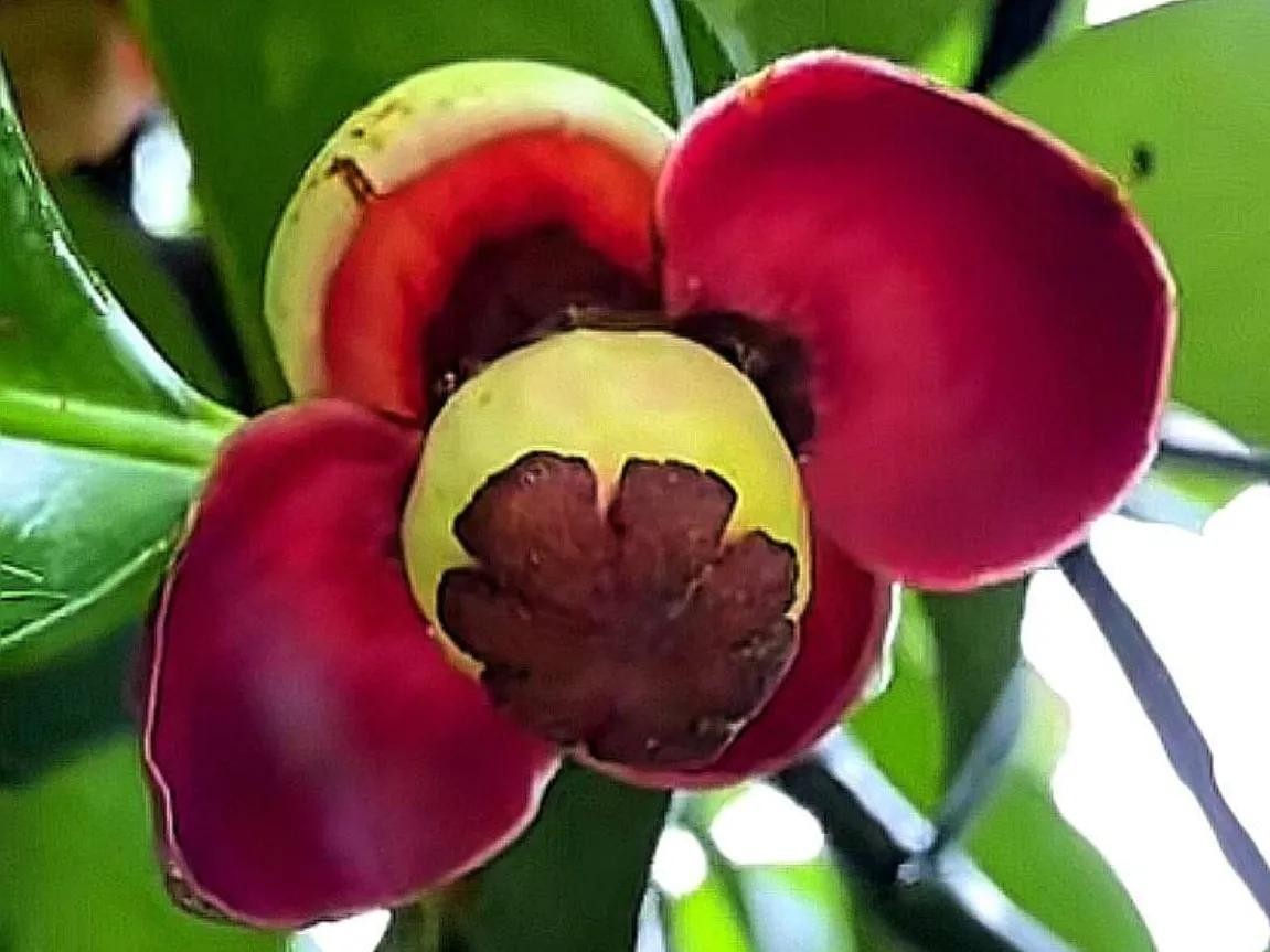 山竹是藤黄科、藤黄属热带水果树。花有雌、雄两种,均生于枝条顶端,雌花略大于雄花。山竹花颜色鲜艳,花形优美。