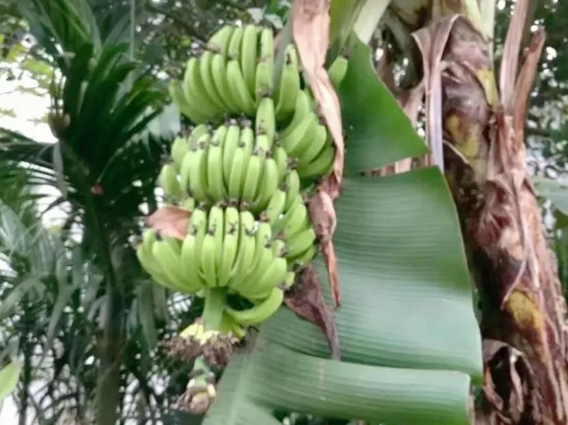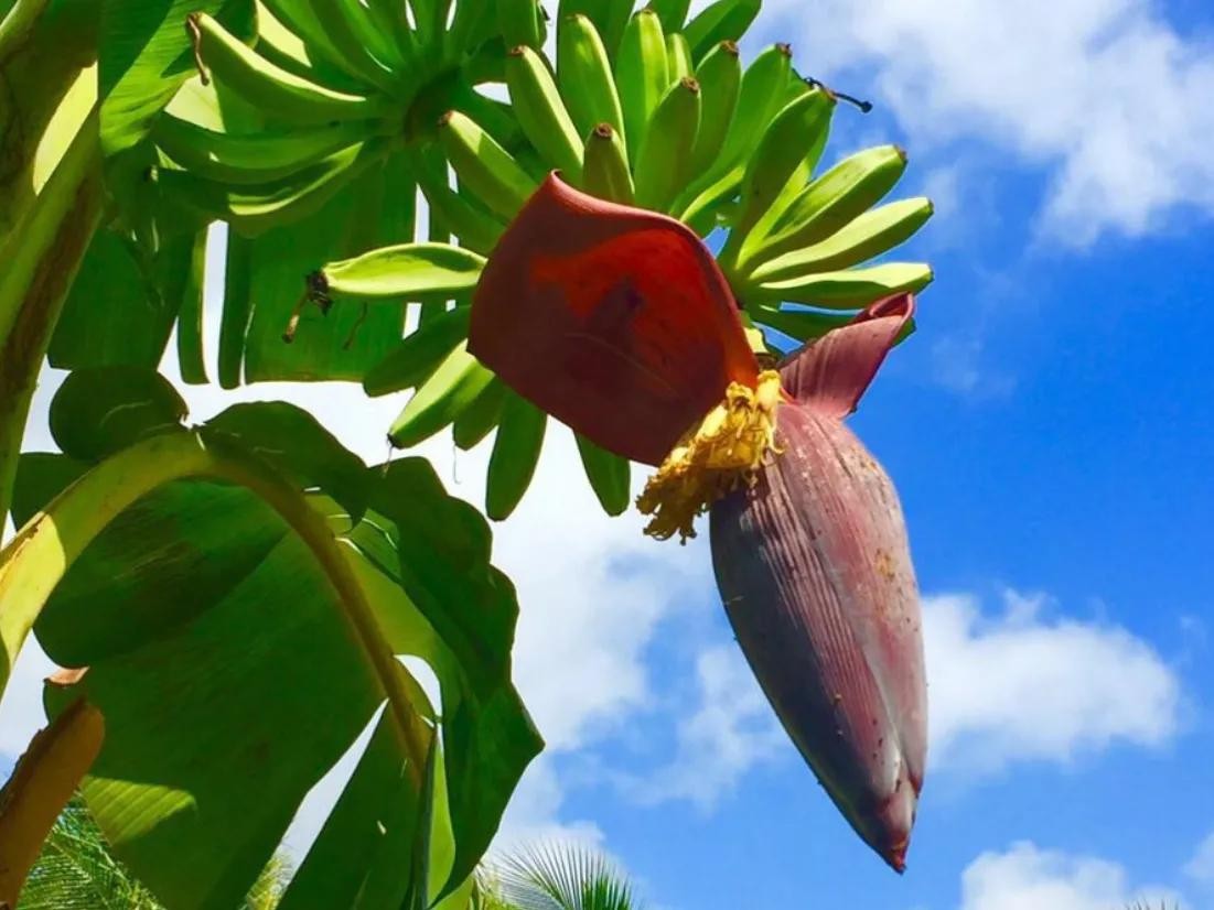 香蕉是芭蕉科、芭蕉属大型草本植物。香蕉的花序为无限穗状花序,从植株假茎顶部抽出,自然下垂。花自上而下一层一层陆续开放,每两层花之间都有船底型的苞片将其分开。香蕉的花并不显眼,显眼的是色彩鲜艳的苞片,苞片因品种不同而有不同颜色:粉红、紫红、橙黄等。