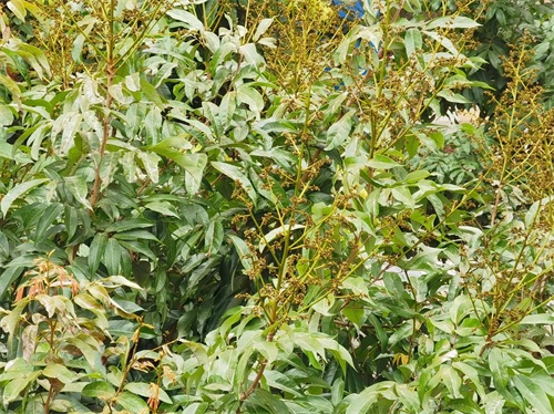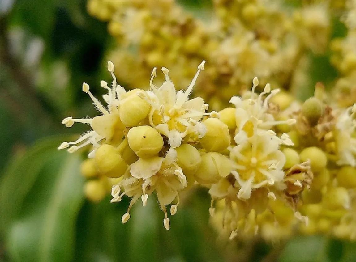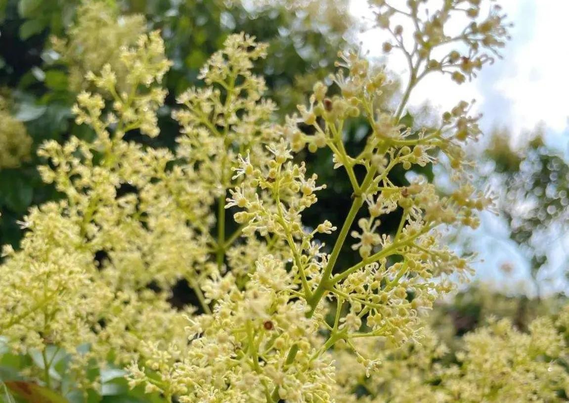 荔枝是无患子科、荔枝属常绿乔木,主要产于我国广东、广西和福建。花序顶生,阔大,多分枝,花色黄中透绿,小巧玲珑的花朵一串串、一簇簇,非常繁茂。盛花期树冠上满满的荔枝花,有点像接近成熟的麦浪,又似飘香的桂花。