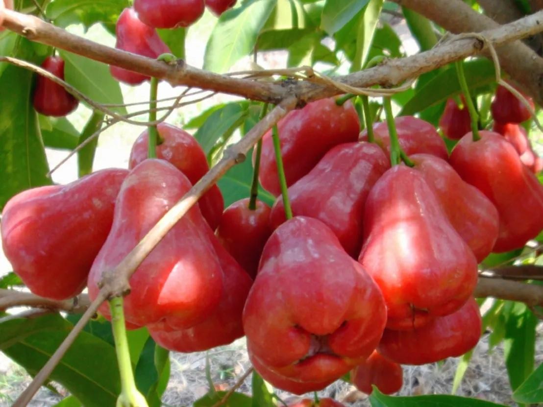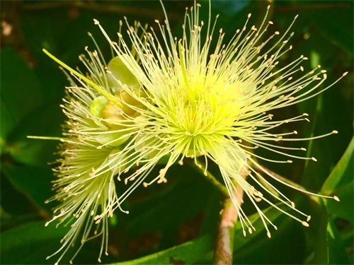 莲雾系桃金娘科乔木。花瓣白色,可是我们看到图片里的花并不是白色,而是黄绿色,为什么呢?因为莲雾的花基本上被繁密、修长、艳丽的雄蕊给遮挡住了。莲雾在我国广东、广西、海南和台湾等地有栽培。