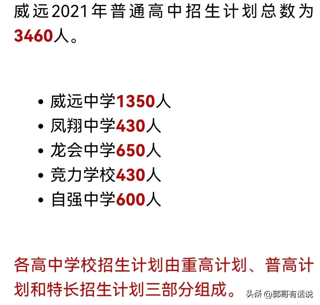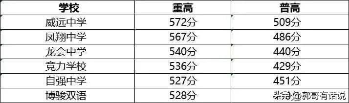 从今年全县六所高中的录取分数来看,最低分是愽骏双语的410分,而威中的普高由于今年是面向全县考生招生(以前威中普高只对本县少数几个镇招生),所以录取分数线达到了509分,而往年一般不超过500分。另外要说明的是,在开学分班时,可能并不一定是按下表中的重高普高成绩分班,一般是按中考成绩从高到低分班,在重高人数不够的情况下,也可能把没上重高线的学生分到重高班,班别设置可能也不仅仅分重高普高,所以在被一所学校录取后,并不一定是普高成绩就只能在普高班!