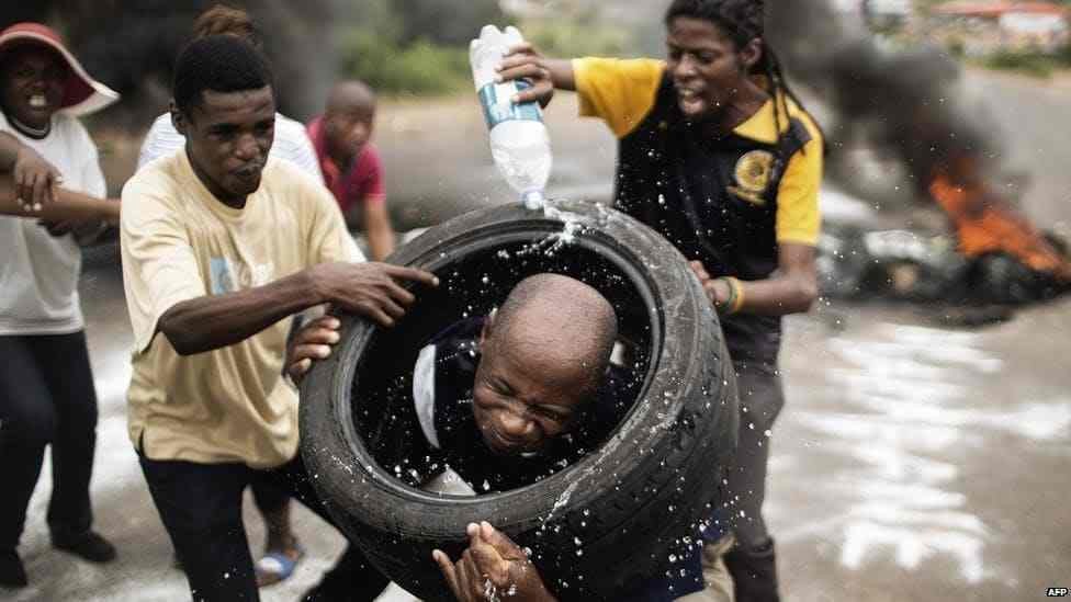 他们将沾满了汽油的轮胎套在犯人身上,然后将轮胎点燃活活烧死犯人。融化的轮胎黏在皮肤上,犯人挣扎时会将轮胎和皮肤一同扯下,现场极其残忍。