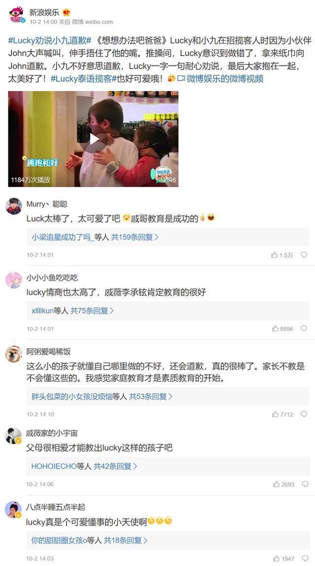 Lucky这样的高情商也受到了观众们的好评,还被顶上了热搜。网友们都说Lucky能有这样的情商,和家里的教育离不开关系,可见李承铉和戚薇在教育上做得不错。Lucky也被网友们称为懂事可爱的小天使。