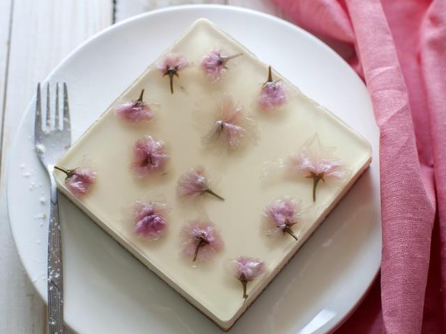 7、盐渍樱花用温开水泡开,吉利丁糖水液淋在慕斯表面,用筷子夹起泡好的樱花,分散放入吉利丁糖水液中,冷藏2小时以上;