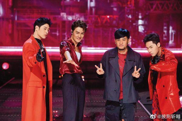 今年台湾哥哥们实力强劲,潘玮柏(左起)、吴克群与张震岳的初舞台表现精彩,拿下团体第一名。右一为中国大陆歌手ICE杨长青。(图/翻摄自《披荆斩棘》微博)