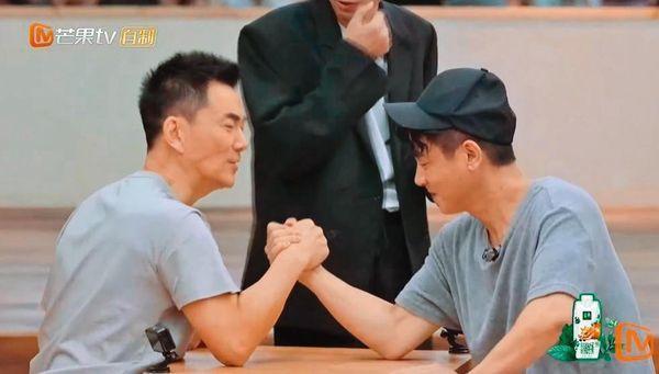 任贤齐(左)与陈小春(右)2个队长比腕力争取出场顺序,为了团队互不相让。(图/翻摄自芒果TV音乐 YT)