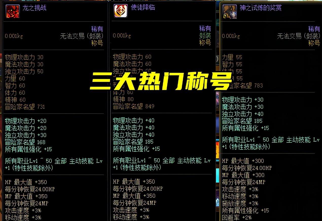 地下城称号很多,上至双至尊,下至白板南瓜勇士,按照常理而言,一般称号1-2年会更新一次,好的称号不仅能带来更强属性,而且还能带来更大排面,所以在很大程度上,称号就是一位玩家的强度象征,过气称号早已淘汰,但有一款称号是例外的!