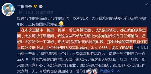 十月十日,斗鱼主播油条表示进行48小时公益直播,即连续直播目前很火的游戏《绝地求生》48小时,所得收入捐献给爱心狗活动,主播油条的这次公益行为成为主播界的焦点事件。在48小时中,总共吃鸡38次。然而人红是非多,直接期间主播油条直播间先后被带起了两拨节奏。第一个是说油条献爱心捐款竟然不捐给人而是选择捐给流浪狗。第二个节奏是有网友怀疑主播油条开外挂直播《绝地求生》,随后所有矛头直指开挂吃鸡。