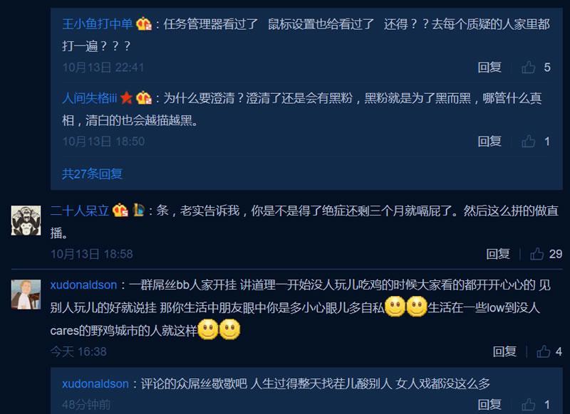 在十月十五号下午直播的过程中,油条甚至直接把直播间标题改为“实锤我开外挂?拿出干货?”,开始和怀疑开挂的观众理论。油条自称自己这么努力地直播了70多个小时,然而不明真相的喷子从头喷到尾,有意无意地带起“魔音油条1”“魔音油条2”“腰射第一人油条1”“腰射第一人油条2”,的节奏,显然是有预谋有组织的,甚至是有意图不轨者。