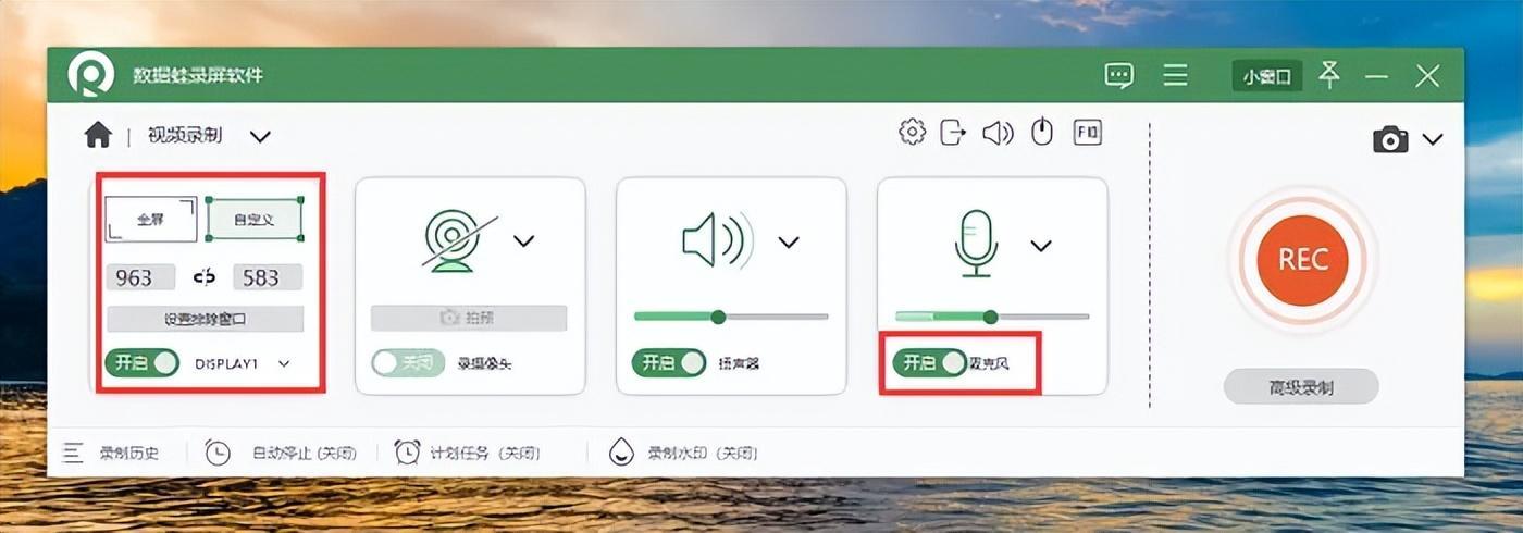 步骤2:在视频录制页面中,您可以选择需要录制的区域:全屏或自定义区域,如果您想进行语音录制,记得提前打开麦克风。